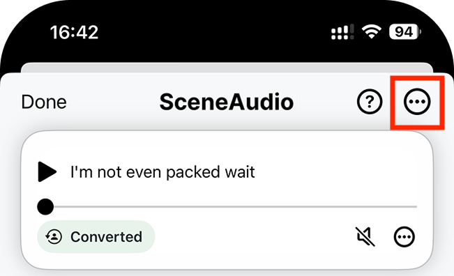 Use SceneAudio AI to convert all recorded lines. Tap more ••• in the top right of the header.